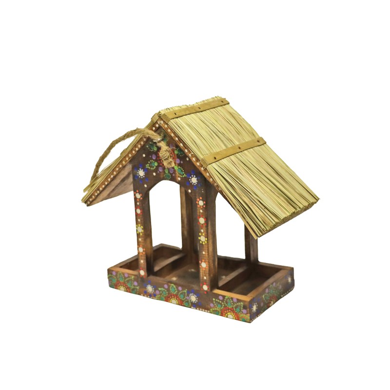 - Artisan Rectangular Thatched Bird Table, a beautifully handcrafted piece created by Balinese artisans using sustainably sourced timber. This bird table is hand-painted in a mix of vibrant colours using a traditional dot painting technique and features a distinctive pitched thatched roof inspired by authentic Indonesian design. The slightly larger entrances are perfect for small to medium-sized birds to feed comfortably on seeds, peanuts, suet, and other safe food scraps while still keeping out larger birds like crows, pigeons, and magpies.