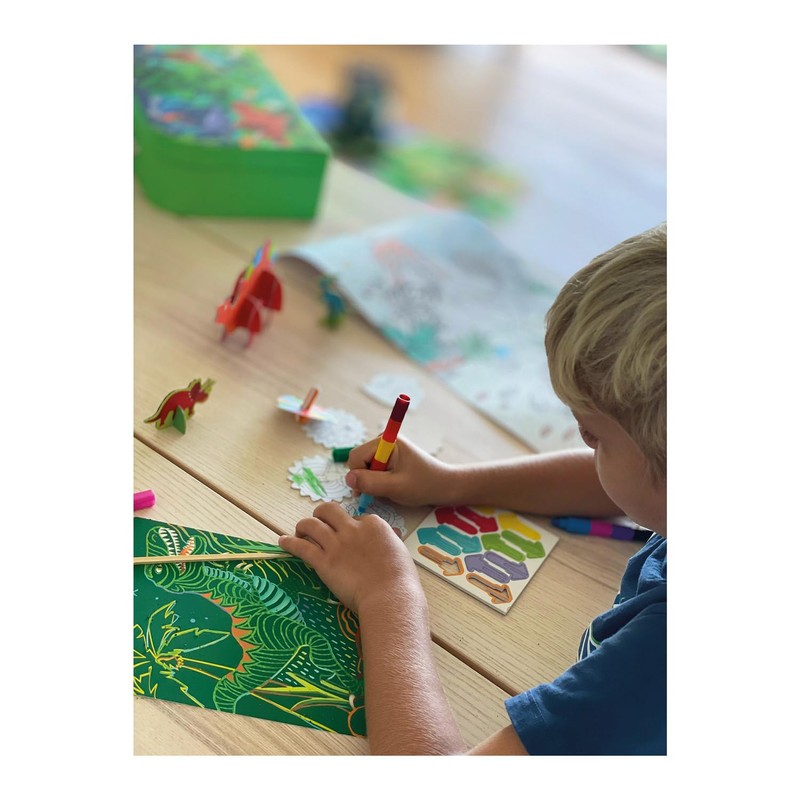 • The set includes scratch pictures, posters, material for spinning tops, a wind chime and a 3D dino.
