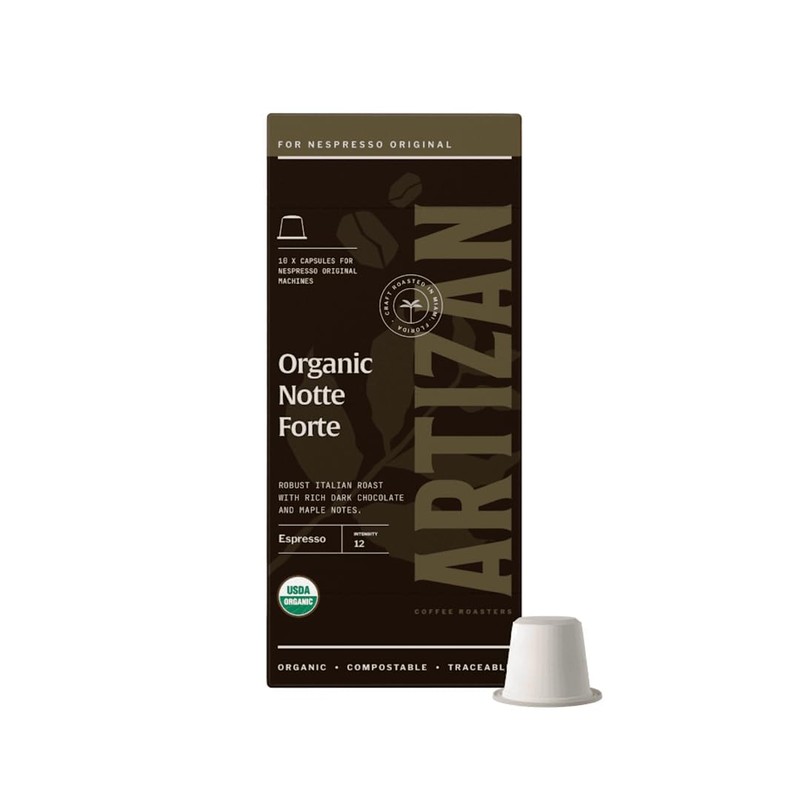 Notte Forte – USDA Organic Espresso Pods | Intensity 12 Bold Italian Roast | Home Compostable Pods for Nespresso Original Machines Bold. Intense. Unapologetically Italian. Experience espresso at its most powerful with Notte Forte—a USDA Certified Organic espresso crafted for those who crave deep flavor and dark roast strength. With an intensity of 12, this robust blend delivers rich notes of dark chocolate and maple in a smooth, full-bodied cup that lingers long after the last sip. Made with organic, non-GMO, mycotoxin-free coffee, this bold roast honors traditional Italian espresso with a modern, clean approach. Roasted to bring out complex flavor and aromatic depth, every capsule delivers an uncompromising espresso experience—strong, smooth, and satisfying. Sustainability Meets Innovation Our capsules are crafted from 100% plant-based materials, making them eco-friendly and home compostable. These innovative capsules preserve coffee freshness without relying on aluminum, plastics, or GMOs. Key Features: USDA Certified Organic Coffee Intensity 12 with bold chocolate and maple notes 100% plant-based, eco-friendly capsule design Certified compostable for home composting Compatible with Nespresso Original machines Free from aluminum, plastic, and GMOs Unlike traditional aluminum capsules—which require energy-intensive recycling and have a higher carbon footprint—our compostable pods offer a cleaner, greener choice. Enjoy intense, premium coffee while reducing waste and supporting the planet. Brew the Artizan difference—bold espresso that’s as conscious and uncompromising as you are. Try Notte Forte today. Note: Not compatible with Nespresso Vertuo machines.
