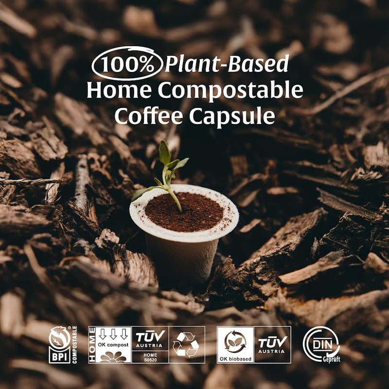 • 100% Home Compostable Plant-Based Capsule: Made entirely from bio-based materials—no aluminum, no plastic. Our pods break down in your home compost, offering a sustainable, zero-waste brewing experience without compromising on flavor.
