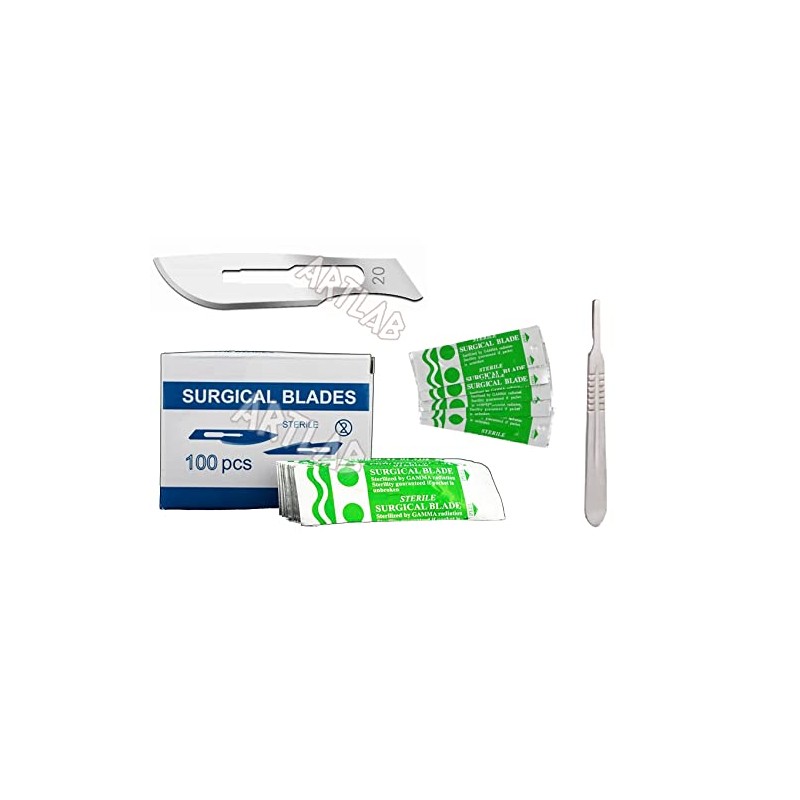 artlab-Pack of 100 Scalpel Blades #10,Scalpel Blades for Knife Scalpel, High Carbon Steel Dermablade Scalpel Blades. Individually Wrapped, Sterile +Free Handle (#20 PACK OF 100+HANDLE)