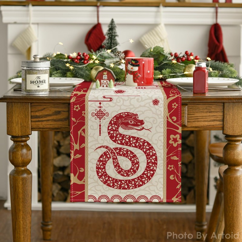 Artoid Mode Paper Cutting Style Chinese Zodiac Snake Happy 2025 Lunar New Year Table Runner, Spring Festival Winter Kitchen Dining Table Decoration for Home Party 13x90 Inch