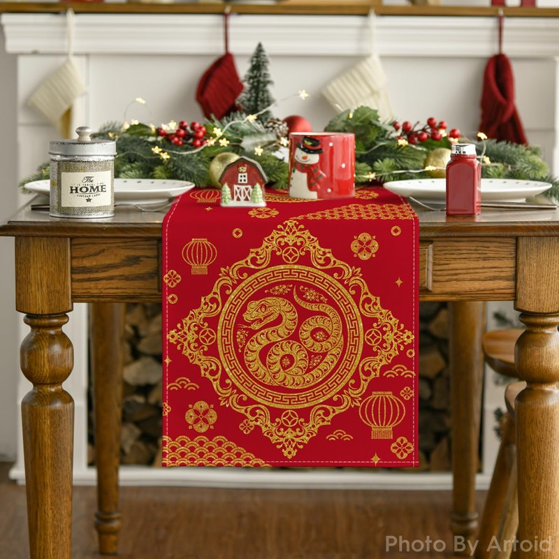 Artoid Mode Red and Golden Chinese Zodiac Snake Happy 2025 Lunar New Year Table Runner, Spring Festival Winter Kitchen Dining Table Decoration for Home Party 13x48 Inch