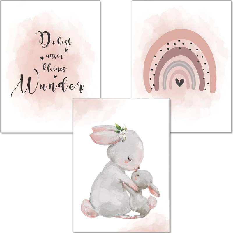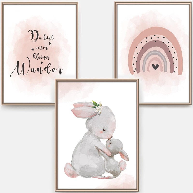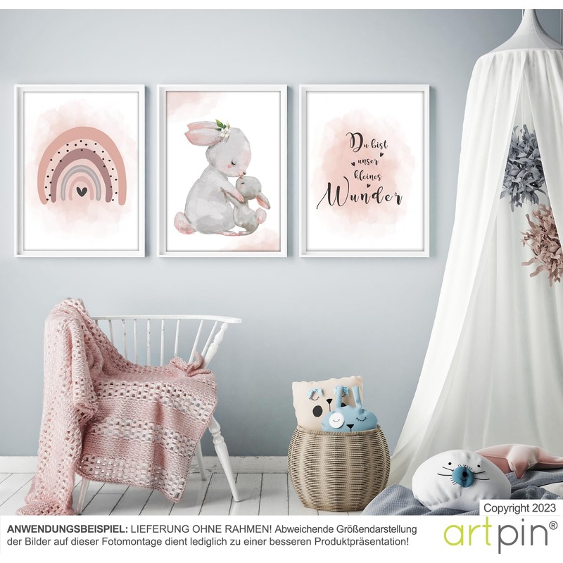 artpin® Children's Room Decoration Poster, A4 Pictures, Baby’s Room, Set of 3, Pink, Grey, for Girls, Rainbow, Rabbits (K5)