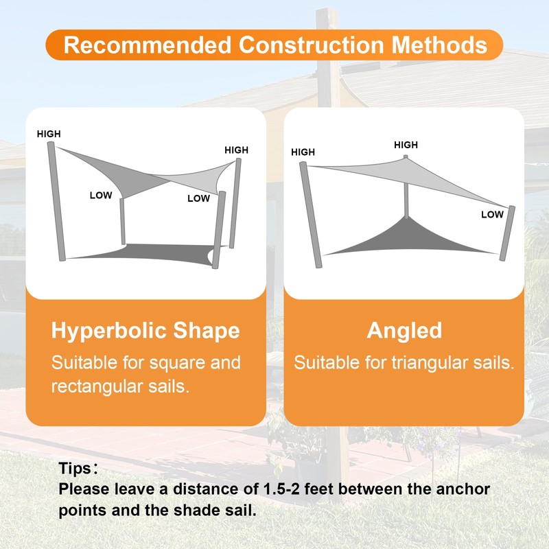 - 【Easy Installation & Professional Guidance】 Since the sunshade sail needs to be fixed with ropes , the size of the sunshade sail you purchase will definitely be about 1.5-2 feet shorter than the distance between your fixed points. Therefore, Reduce your anchor distance by 1.5–2 ft,or multiply it by 88% to determine the correct sail size, and you will know the size of the sunshade sail you need to purchase. Contact us for size advice if unsure. Please note: Hardware kit is sold separately.