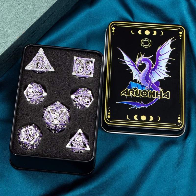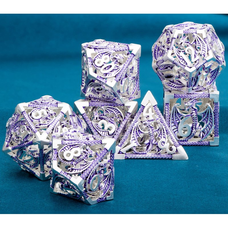 ARUOHHA Hollow DND Metal Dice Set 7PCS Silver Purple Role Playing Games Dice with Gift Box, Dungeons and Dragons D and D Dice D+D Polyhedral Dice RPG D&D Dice Set D20 D12 D10 D8 D6 D4