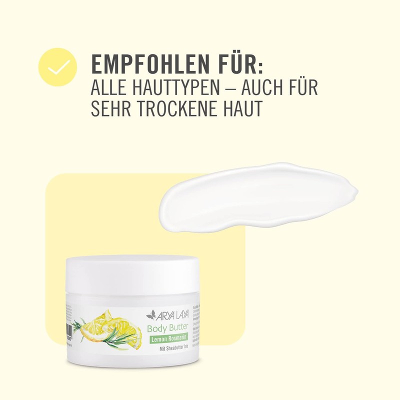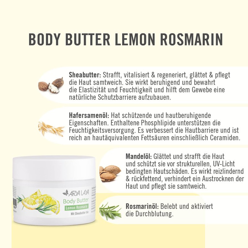 ARYA LAYA Body Butter Lemon Rosmarin, 200 ml - reichhaltige & zartschmelzende Körperbutter mit Sheabutter bio, auch geeignet für trockene Haut, zitronig-frischer Duft mit feiner Rosmarinnote, vegan
