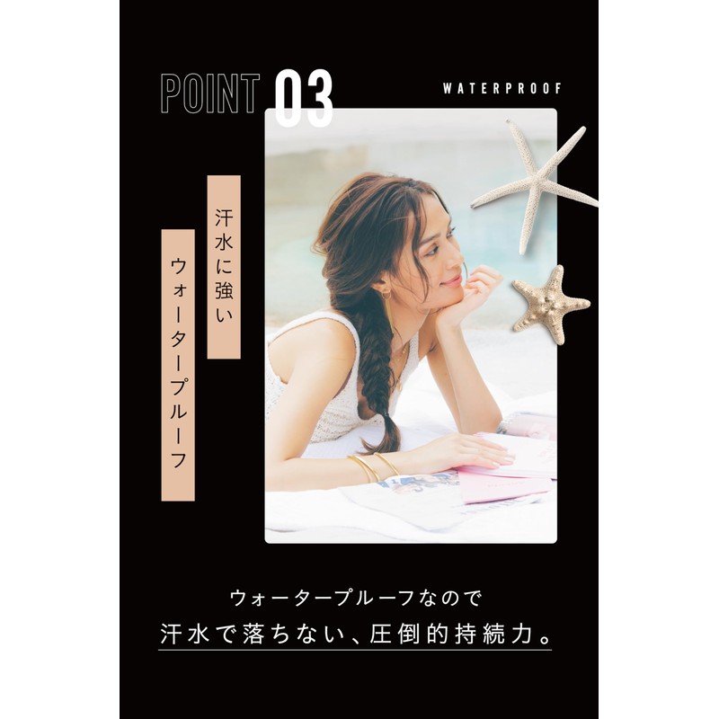 - (Waterproof so it is resistant to sweat water) A highly sustainable waterproof formula. It maintains its beauty even when it gets wet or sweaty, so it is great for hot summer days, sports, outdoor activities, and oceans