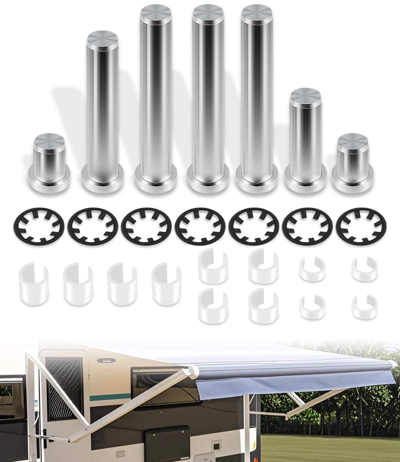 (5) Power awning arm repair hardware pin kit for RV camper trailer. Stainless steel awning hardware. A budget-saving solution if you need to replace your existing overused awning hardware. Restore your RV power awning functionality to retract/extend pivots arm smoothly.