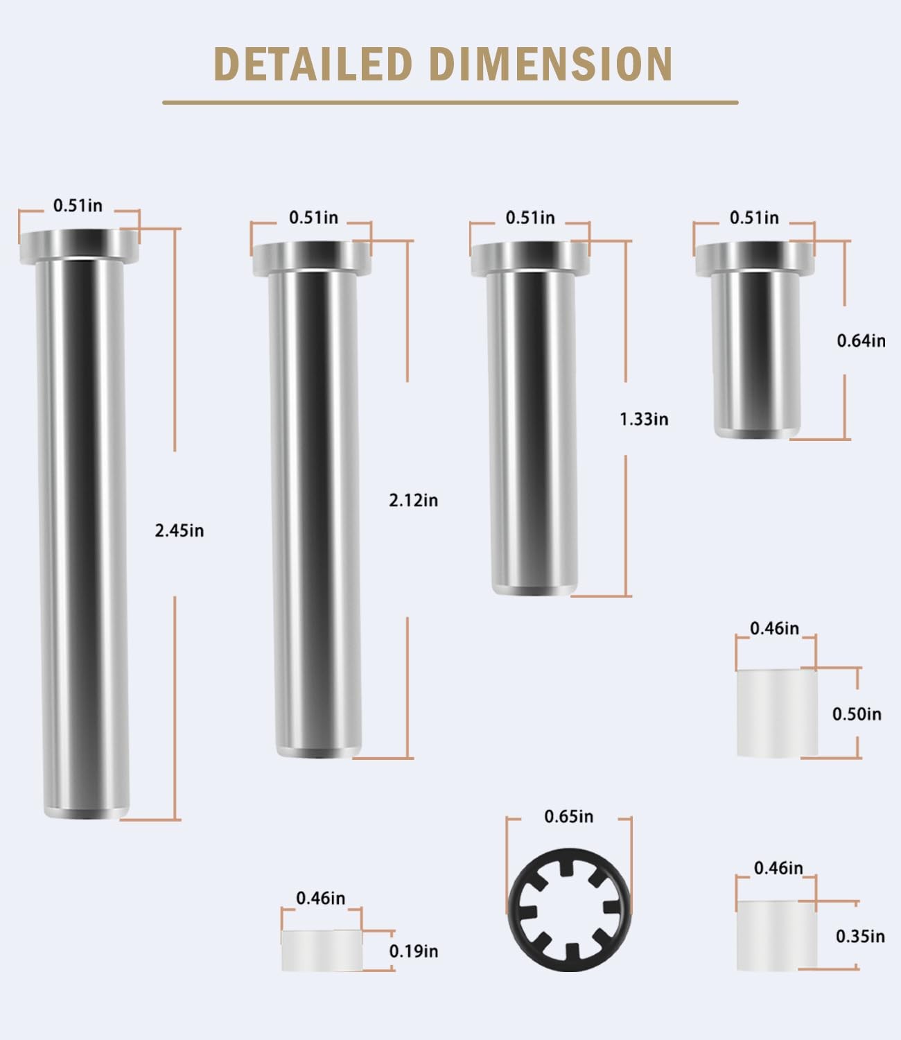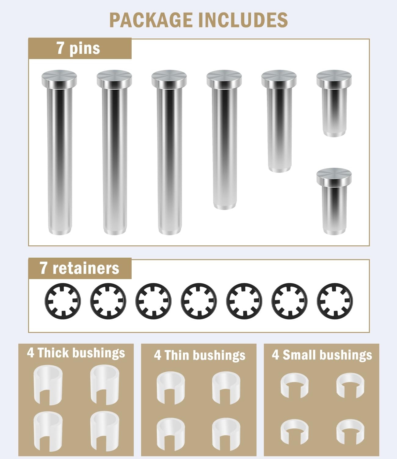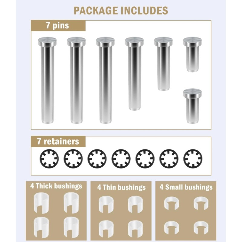 Includes: 7 pins,7 retainers, 4 Thick bushings, 4 Thin bushings, 4 small bushings