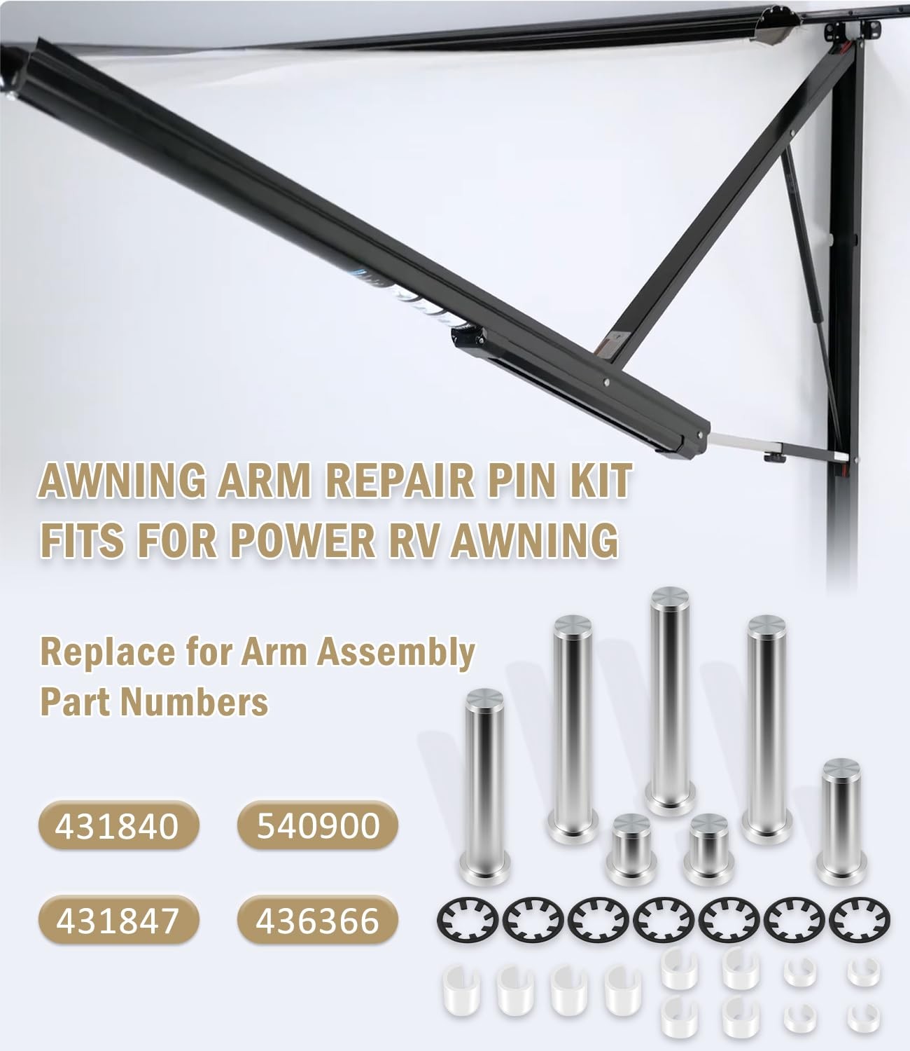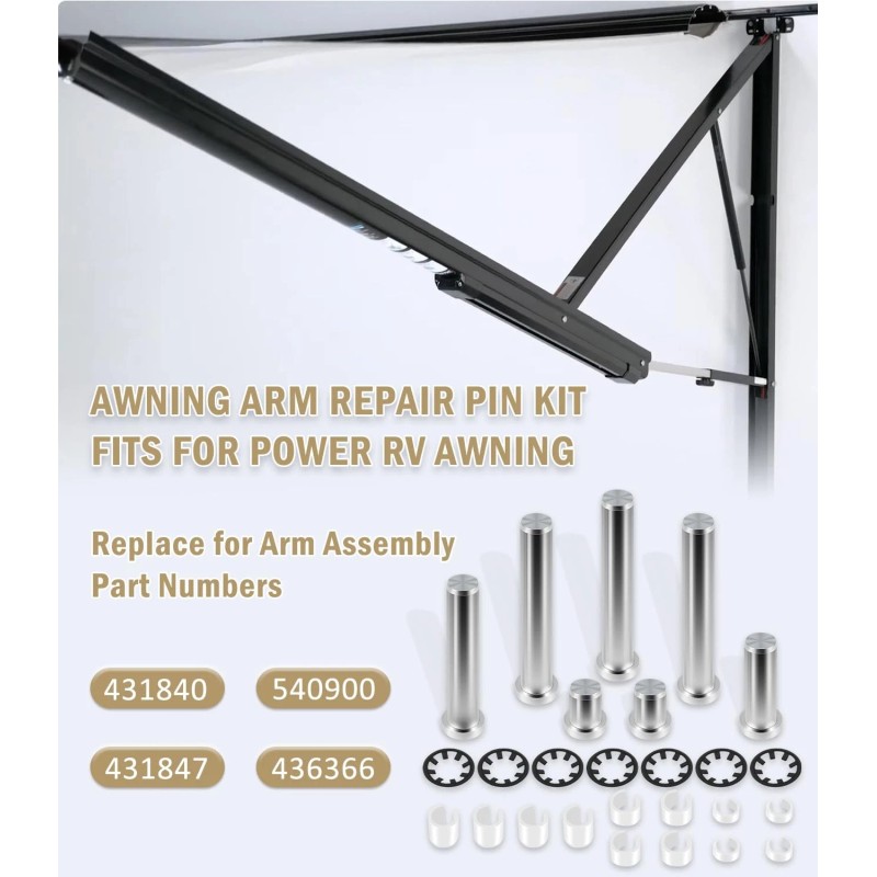 This Awning Arm Repair Pin Kit Fits for Power Rv Awning. Replace for Arm Assembly Part Numbers: 431840 / 540900 / 431847 / 436366