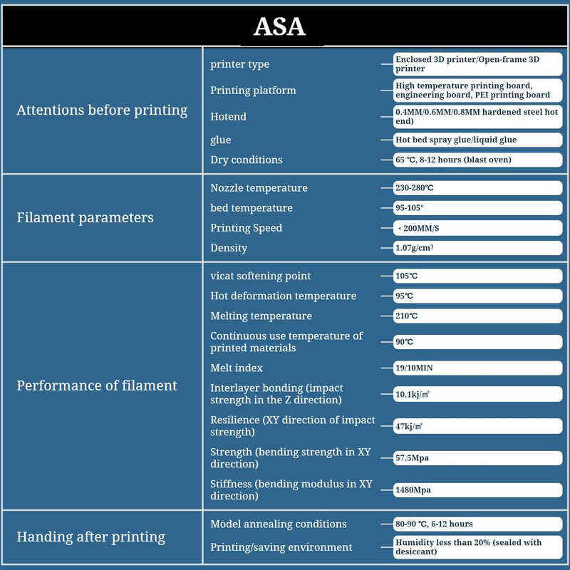 - 1.High Heat Resistance and Mechanical Properties:ASA can resist temperatures up to 100℃ (212℉) and display high toughness and impact resistance for functional application.