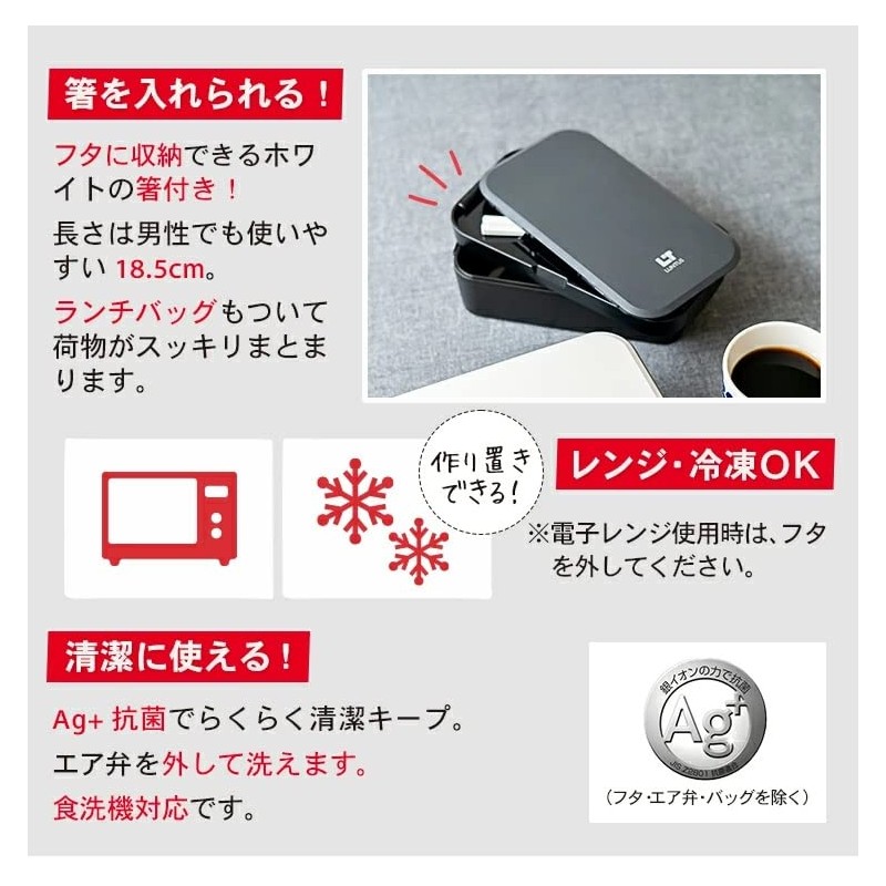 - Material: Chopsticks Lid: ABS resin, Chopsticks = AS resin, Lid: AS resin/thermoplastic elastomer, Main Body/Partition/Clasp/Valve Body: PP, Valve = Silicone rubber, Lunch Bag: Nylon, Belt (for bags): Polyester/Rubber/Nylon
