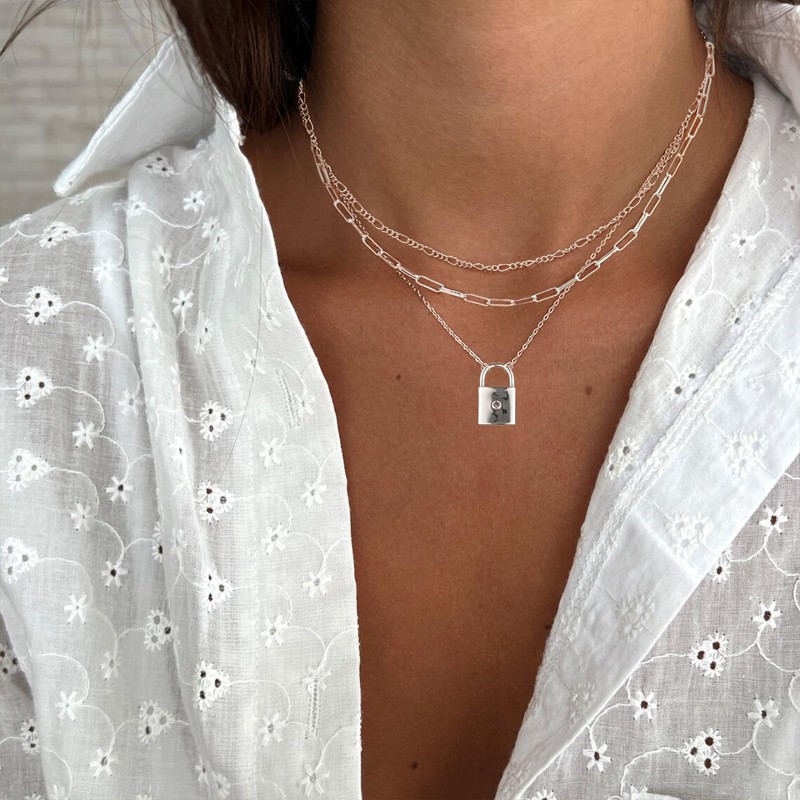 - Silver Layered Necklaces Size: Figaro chain length: 14”+2” extender, Paperclip necklace length: 15”+2” extender, lock pendant necklace length: 16.5+2”; Each necklace has an individual lobster clasp and extension chain