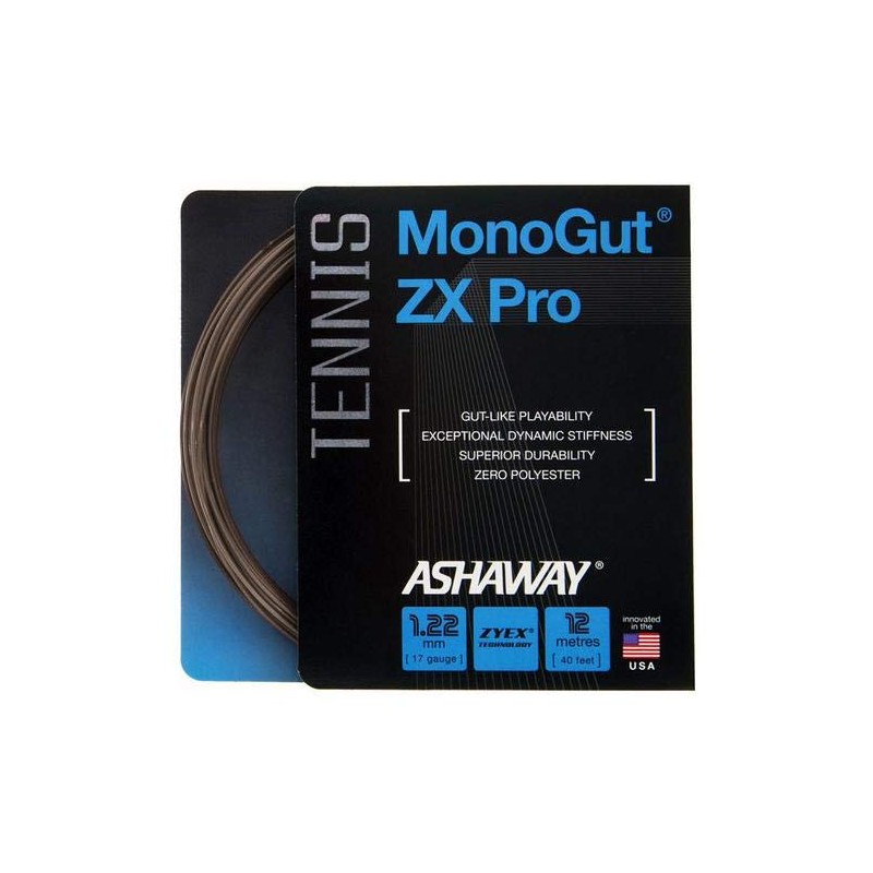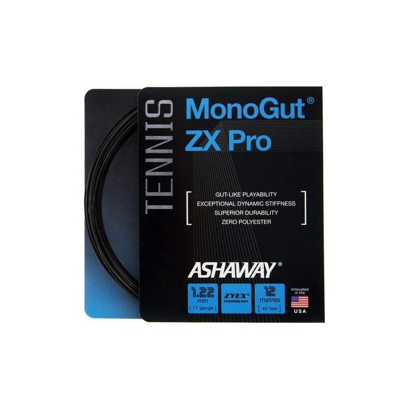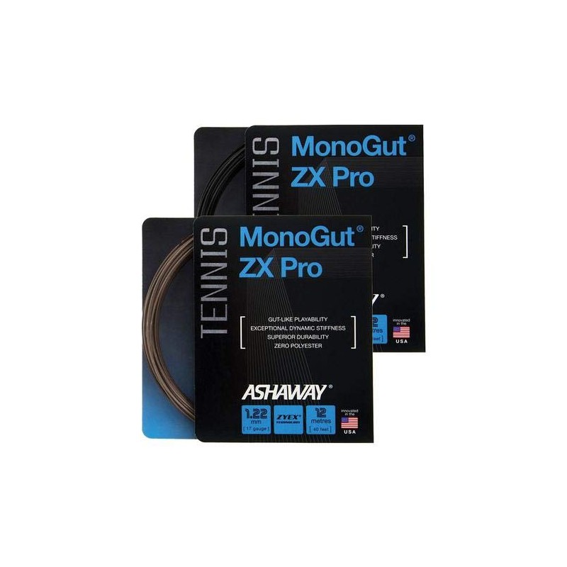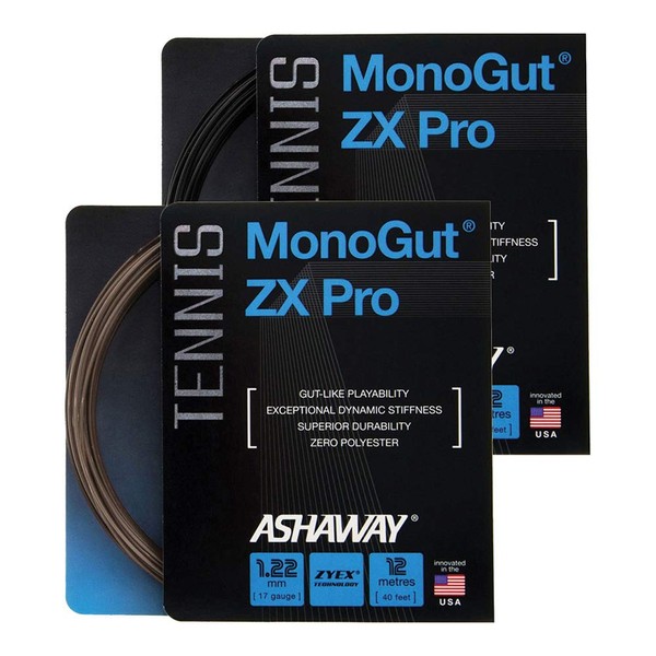 Players who want the playability, power and comfort of natural gut without the price premium will enjoy Ashaway Monogut ZX Pro 17 string. This string utilizes an advanced material known as Zyex. Zyex has an inherently low dynamic stiffness, resulting in increased energy return to the ball and a more responsive feel than polyester based strings. The absence of polyester additives increases string elongation while decreasing stiffness, resulting in natural gut-like playability that has better tension maintenance than other polyester or nylon offerings. The Zyex monofilament construction offers better durability and resistance to conditions like humidity and moisture compared to natural gut. The 17 gauge diameter offers the ultimate in feel and response while trading a slight reduction in durability. Ashaway Monogut ZX Pro 17 is an excellent option for players who want the durability of a monofilament but with better response, tension stability, power and comfort than a poly can offer. Please note: String will look thicker than normal. Once you start stringing the racquet, it will play and feel like a 17 gauge.