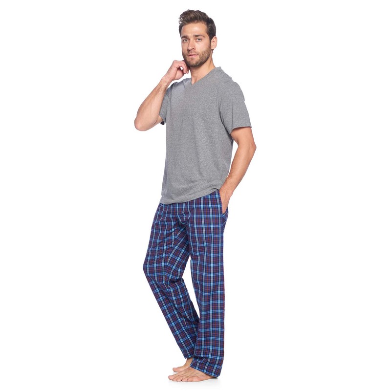 Ashford & Brooks Men's Woven Short Sleeve Jersey Top & Pajama Pants Set - Blue/Burgundy - Large