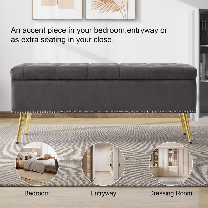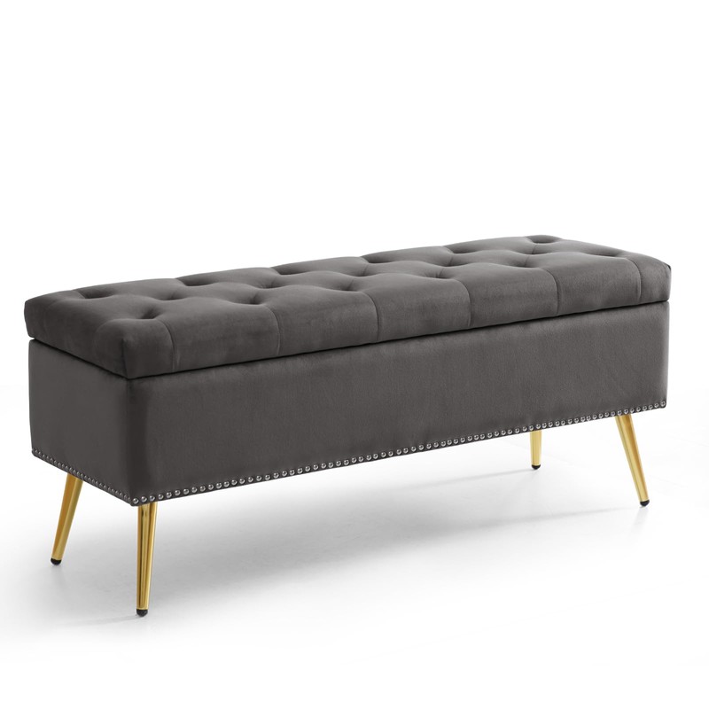 ASHOMELI 45.6 Inches Storage Ottoman Bench, End of The Bed Stool with Legs, Velvet Fabric Ottoman with Storage, Versatile Seating for Living Room, Bedroom and Entryway (Grey)