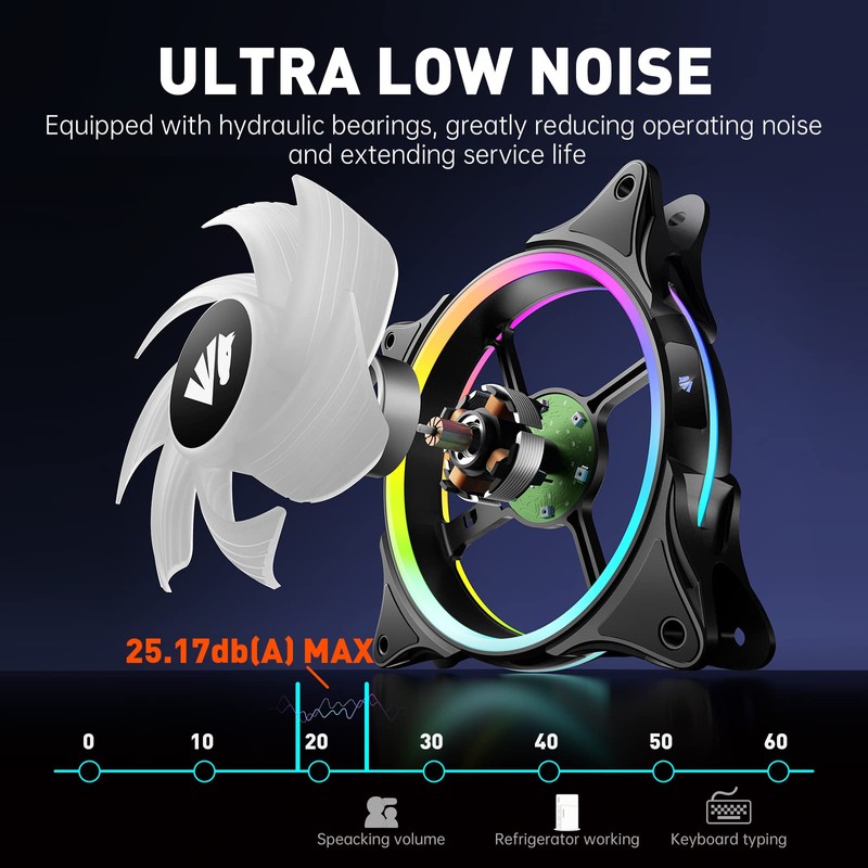 - Experiencia ultra silenciosa a 22,65 dB: Si bien proporciona un rendimiento de refrigeración excepcional, nuestro ventilador de chasis 9002 (120 mm) mantiene el nivel máximo de ruido en solo 22,65 dB (A). El diseño único de 9 asas y las 4 almohadillas de goma que reducen el ruido reducen significativamente el ruido del viento y la vibración, lo que crea un entorno de trabajo y juego más silencioso.