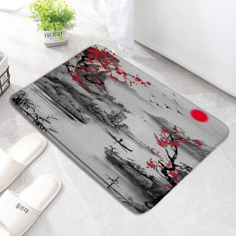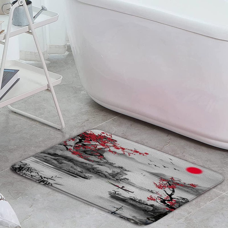 Asian Decor Bath Mat Rugs Red Plum Blossom Branch Japanese Bamboo Trees Sun and Misty Mountains Art Chinese Traditional Ink Bathroom Indoor Carpet Bathtub Carpet Absorbent with Lining 17.7 x 29.5 Inch