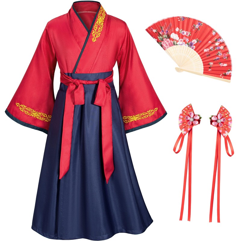 Asian Traditional Dress Kimono Robe for Kids Girls Costume Silk Folding Fans hairstick Cosplay(Red Navy 120cm
