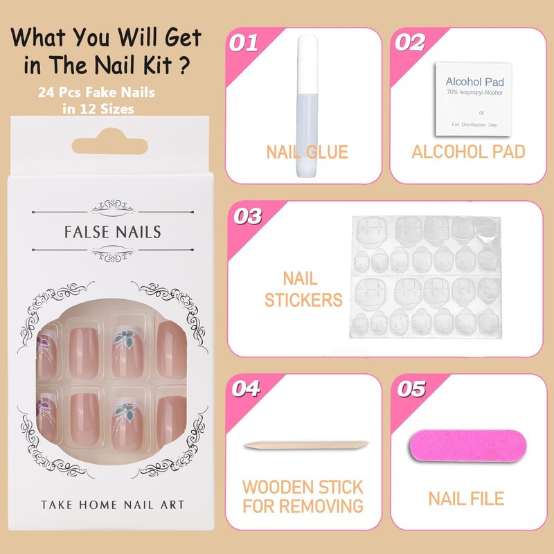 - Package Included - You will receive a nail kit of 24 Pcs fake nails in 12 sizes, 1 nail glue, 1 alcohol prep pad, 1 sheets of multi-size Jelly adhesive tabs, a mini double-sided nail file, and a wooden stick, which can help you decorate your nails easily, and for easy removal of fake nails.