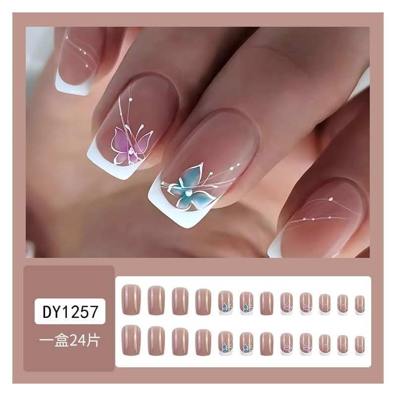 ASONRL French Press On Nails, Short Medium Square Fake Nails with Nail Glue, Nude False Nails Press on with Butterfly Design for Women in 12 Sizes-24 Pcs Stick on Nails Kit - Butterfly