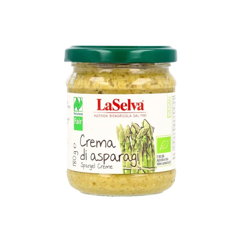 Processing: aturland fair certified. A mild "Crema di asparagi" made from freshly harvested, green LaSelva asparagus and refined with onions. With 75% asparagus, you can enjoy the intense taste of the vegetables. Processing/preparation: our asparagus cream tastes pure as an appetizer on roasted white bread. It can also be used with boiled potatoes or can be used as a pasta sauce, refined with cream. Certification/en * EU organic seal