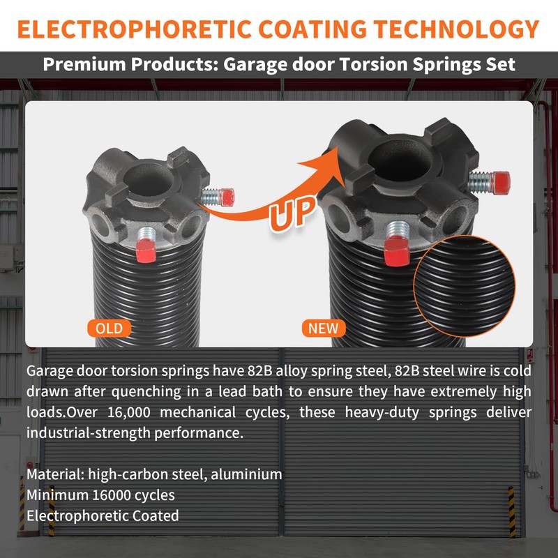 - Rugged Material - Garage door torsion springs have 82B alloy spring steel, 82B steel wire is cold drawn after quenching in a lead bath to ensure they have extremely high loads. When 82B diameter is 8.0-10 mm, the tensile strength is 1080-1200MPa. It is a widely used superior spring material, over 16,000 mechanical cycles, these heavy-duty springs deliver industrial-strength performance.