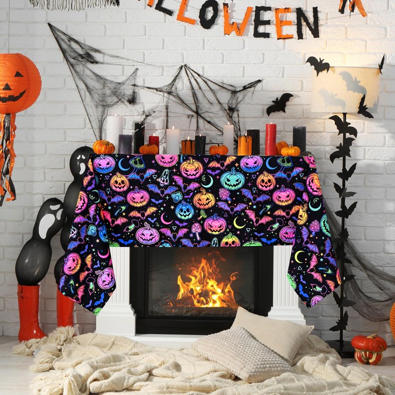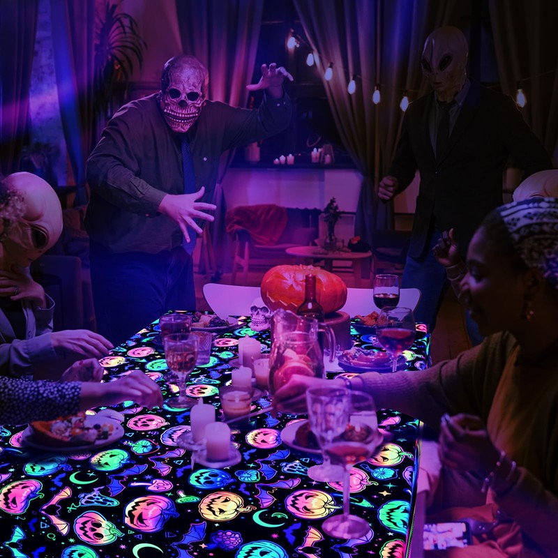 - 【Halloween Decorations】Our Halloween tablecloth square is designed with classic patterns related to Halloween theme, such as spooky pumpkin, and bat, It shows a horrible fluorescent effect under ultraviolet light, creating a strong and spooky Halloween atmosphere.
