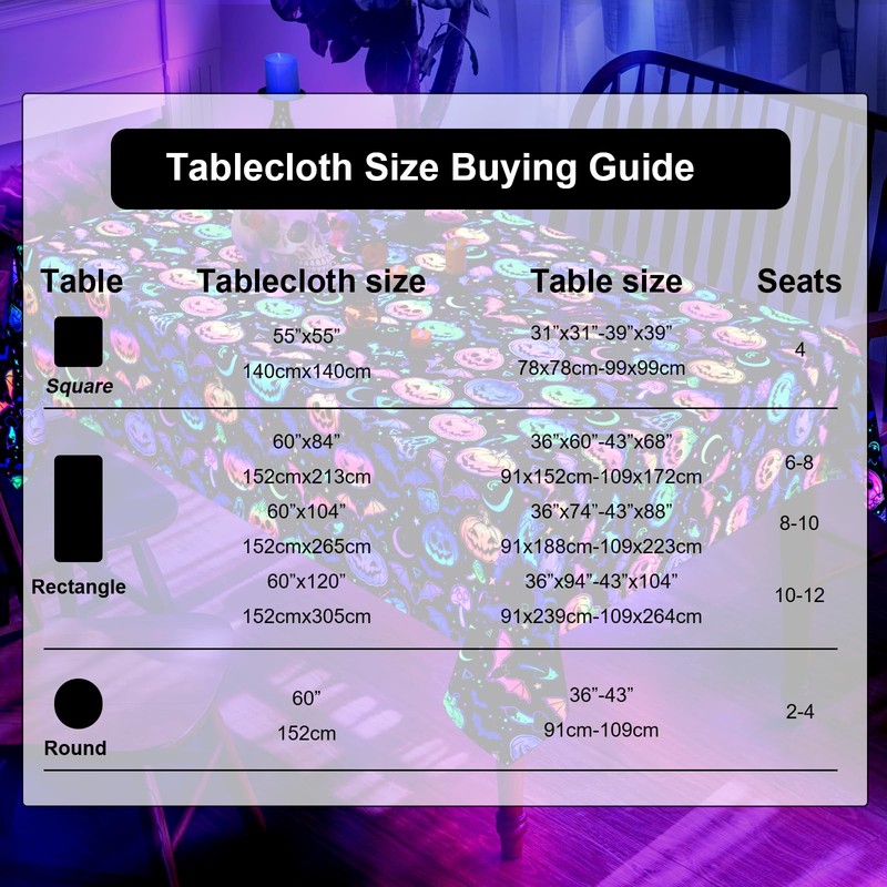 - 【Size Guide】Decorate the tables for your Halloween party with our Halloween table cloth square which comes in 5 sizes: 55" x 55", round 60", 60" x 84", 60" x 104", 60" x 120", and fit most table sizes.