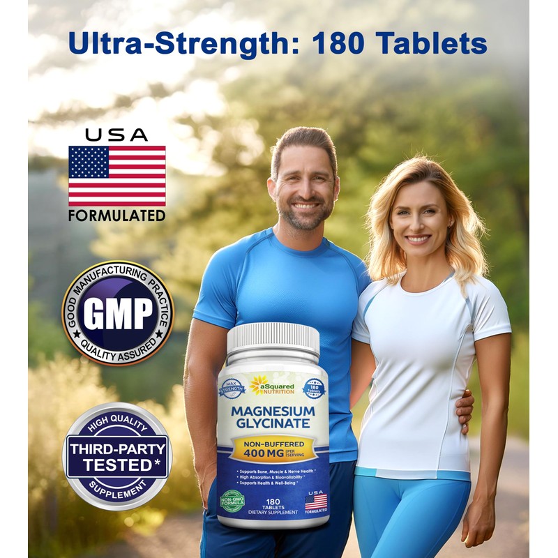 aSquared Nutrition Magnesium Glycinate 400mg - 180 Tablets - Max Strength Magnesium Bisglycinate Supplement -Maximum Bioavailability & Absorption-Non-GMO -Not Buffered-Supports Muscles, Bones & Heart
