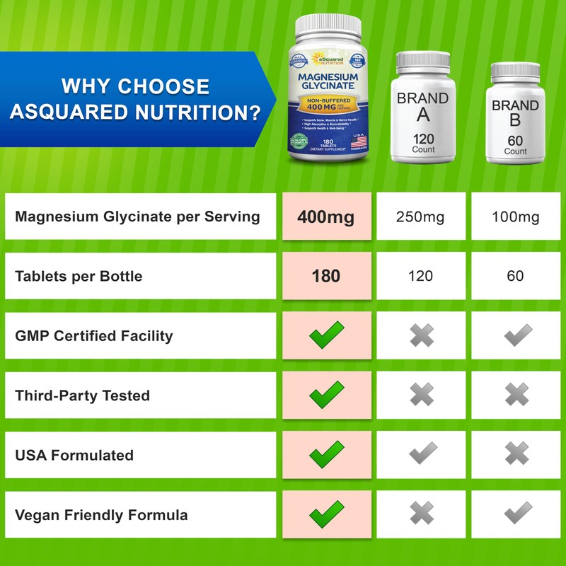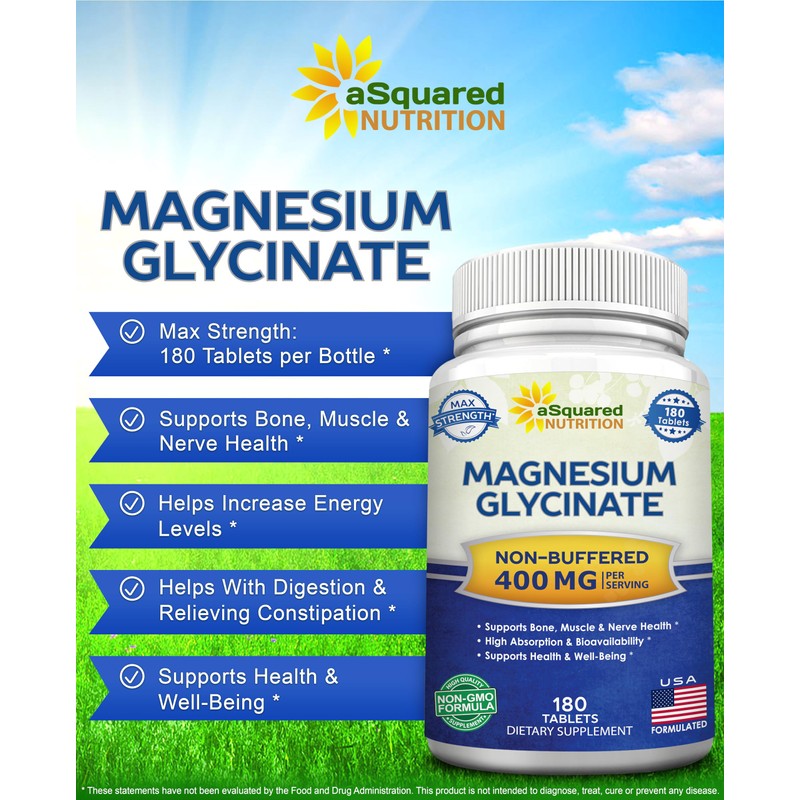 aSquared Nutrition Magnesium Glycinate 400mg - 180 Tablets - Max Strength Magnesium Bisglycinate Supplement -Maximum Bioavailability & Absorption-Non-GMO -Not Buffered-Supports Muscles, Bones & Heart