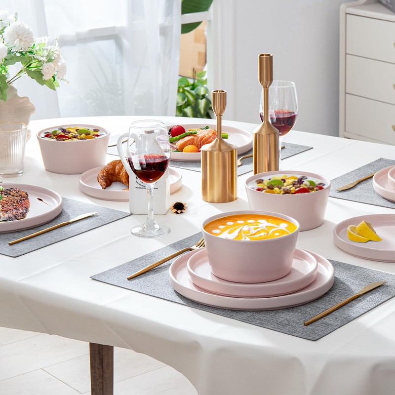 Asrug 12-Piece Plates and Bowls Sets,Ceramic Dinnerware Sets for 4, Chip Resistant and Scratch Dish Set, Dining Dinner Porcelain Dishware, Microwave and Dishwasher Safe,Pink Matte