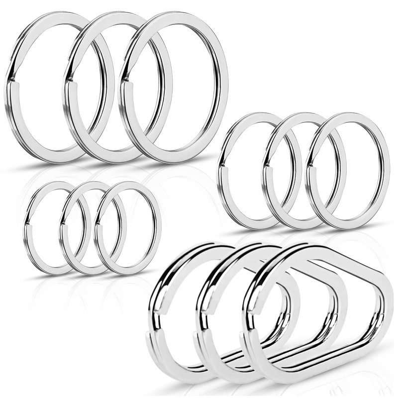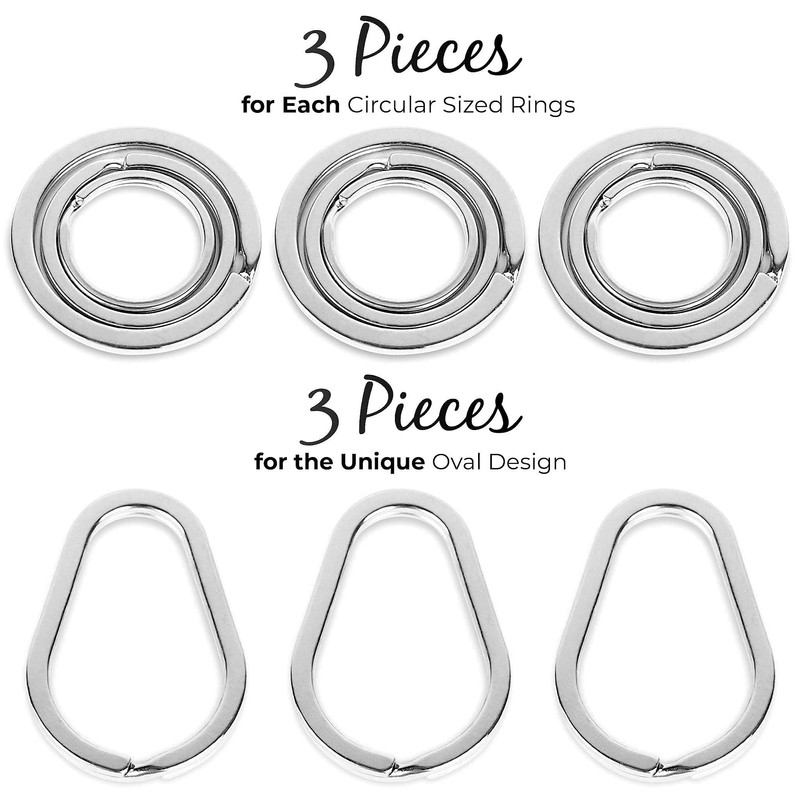• {SHAPES AND DIMENSIONS} (3) oval 1.5" keyrings (3) round 1.25" keyrings (3) round 1" keyrings (3) round .75" keyrings