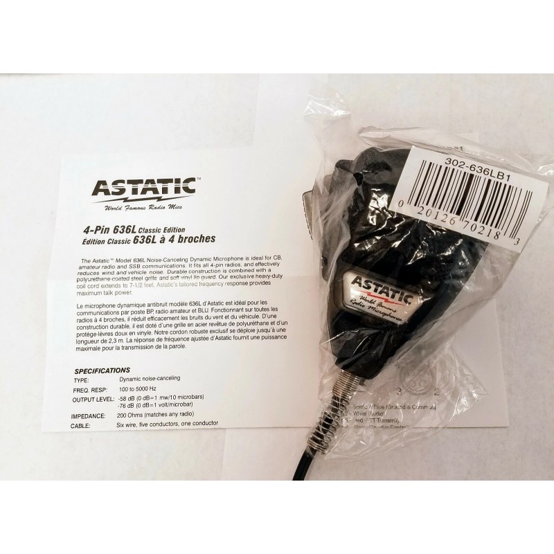 The Astatic Model 636L Noise Cancelling Dynamic Microphone is ideal for CB, amateur radio and SSB communications. It fits all 4-pin Cobra, Uniden and Galaxy radios. Famous 636L dynamic noise cancelling element assures clarity in noisy conditions, and effectively reduces wind and vehicle noise. Durable construction is combined with a polyurethane-coated steel grill, and soft vinyl lip guard. Our exclusive heavy duty coil extends to 7 1/2 feet. Astatic's tailored frequency response provides maximum talk power.