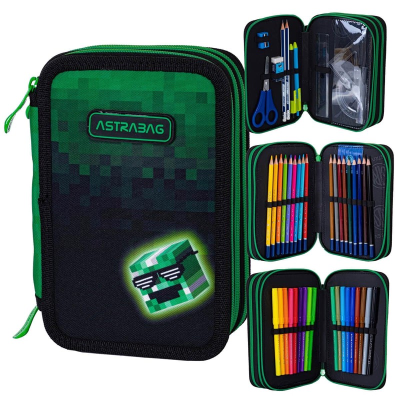 ASTRA BAG Pixel Hero 3-Compartment Pencil Case Filled Triple Pencil Case, Student Case 3-Tier Boys Pencil Case XXL, Pencil Case with Accessories, Motif - Game, Green, pencil case