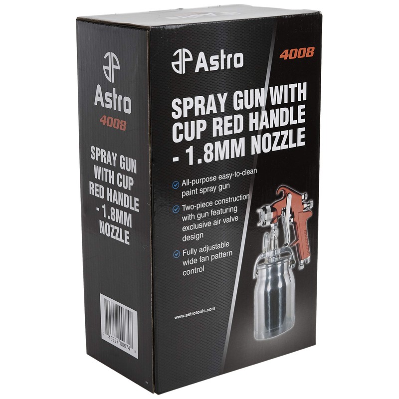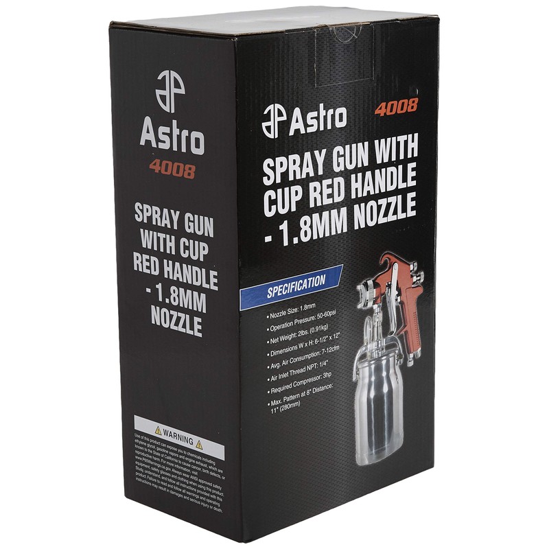 The Astro Pneumatic 4008 Spray Gun with Cup - Red Handle 1.8mm Nozzle is designed for fast application of primers, heavy coatings and glues. This tool will increase productivity and save you money by minimizing waste. Range of use includes body, wood working, production and cabinet shops as well as industrial and marine. Specifications: Nozzle Size: 1.8mm, Operation Pressure: 50-60psi, Net Weight: 3-pound/1.36kg, Dimensions W by H: 6-1/2-inch by 12-inch, Avg. Air Consumption.: 7-12cfm, Air Inlet Thread NPT: 1/4-inch, Required Compressor: 3hp, Max. Pattern at 8-inch, Distance: 11-inch/280mm.