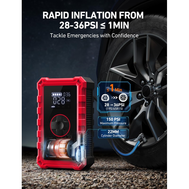 - PORTABLE AIR COMPRESSOR & TIRE INFLATOR: This 150PSI air compressor has 5 preset modes (3 units: PSI, kPa, Bar) to inflate cars, motorcycles, bikes, and balls. It automatically stops at your preset value—no need for constant adjustments or monitoring. The air pump’s high-quality cylinder delivers 25L/Min fast inflation, filling a tire from 32PSI to 36PSI in just one minute. Note: Allow the air compressor to rest for at least 10 minutes after 10 minutes of continuous operation