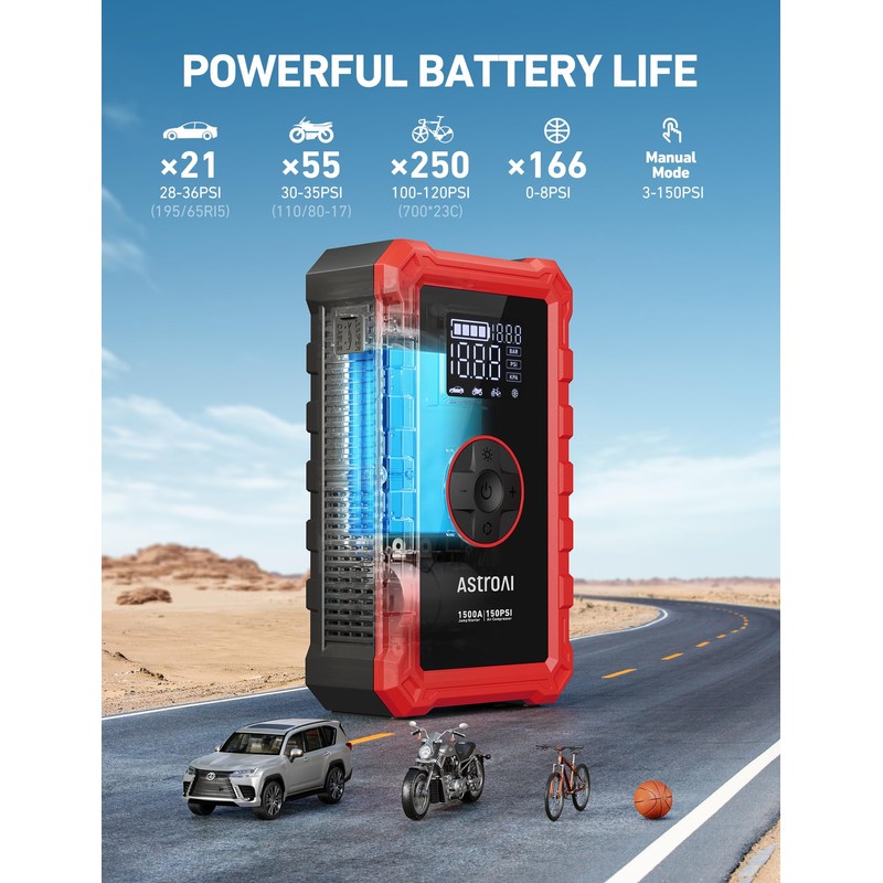 AstroAI S8 Air Jump Starter with Air Compressor, 1500A Peak Car Battery Jump Starter Portable (6.0 Gas/3.0L Diesel) with 150PSI Cordless Auto-Shutoff Tire Inflator, 12V Battery Charger Booster(Red)