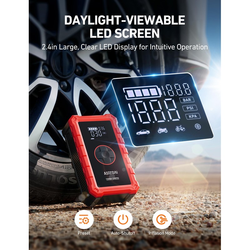 - UNIQUE 2.4" LARGE SCREEN:The S8 AIR Jumpstarter has an intuitive 2.4" digital screen that is readable even in bright sunlight. This portable jump starter detects and displays operational status, battery level, and error codes in real time. When using the air compressor function of this tool, the large screen displays preset values and real-time pressure values, allowing users to read and monitor the inflation process all at once
