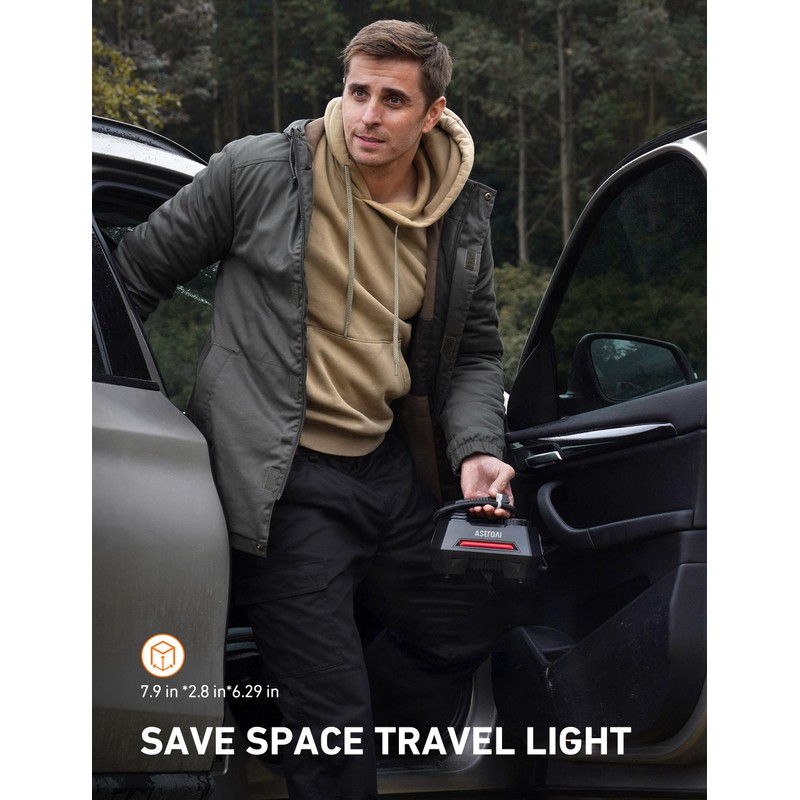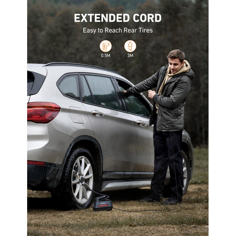 The AstroAI 100PSI portable air compressor quickly inflates your car’s tires when you’re on the go. Whether you’re at home or on the road, checking and adjusting tire pressure are done quickly. Just set your car’s recommended tire pressure into the programmable LCD screen and this little pump brings tires up to their correct pressure in a flash.