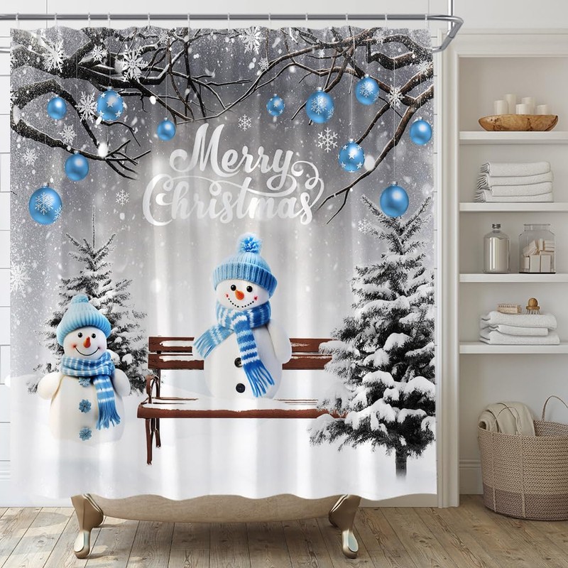 ASVEAS Blue Snowman Shower Curtain Merry Christmas Pine Trees Branches Snowfield Snowflake Winter Holiday Fabric for Bathroom Decor Bathtub with Hooks(70" WX70 H)
