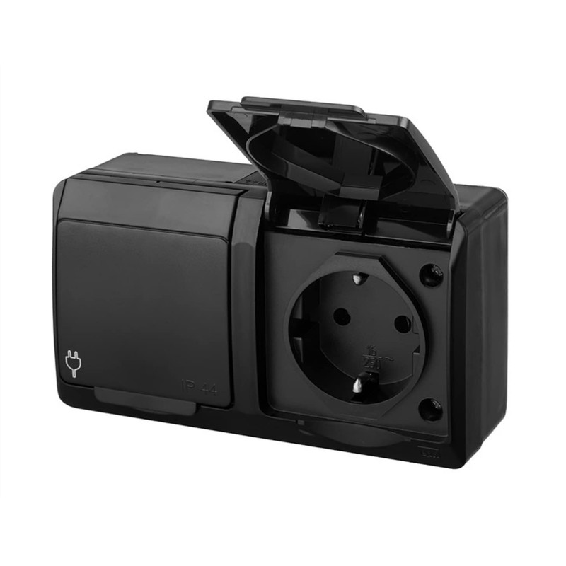 asvendo elektro Hermes Modern Surface-Mounted Series / Light Switch / Double Switch / Multiple Socket / IP44 Waterproof / Outdoor / Black (2-Way Socket)