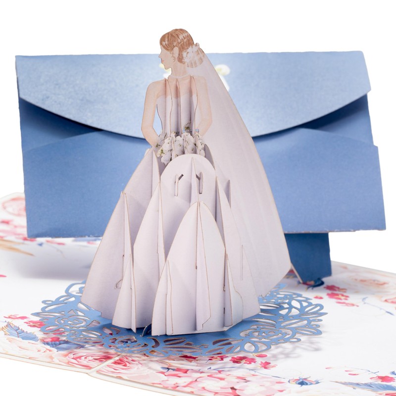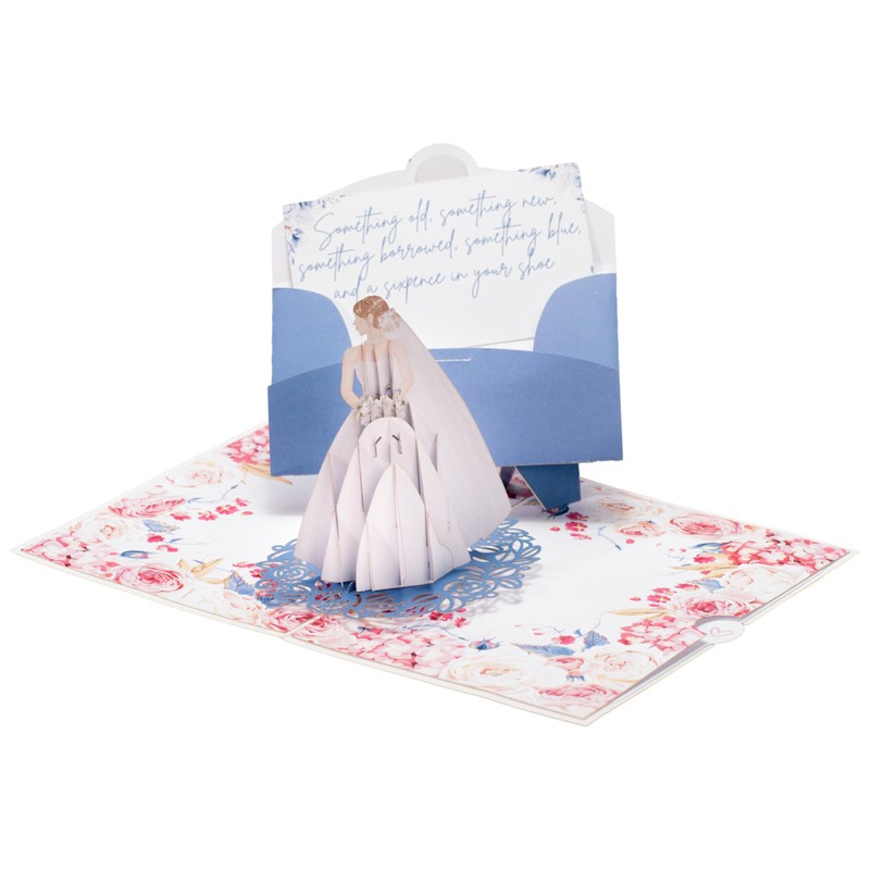 - A TIMELESS GIFT FOR THE BRIDE: This beautifully designed 3D pop-up card is a heartfelt way to present the bride with her "something blue" and a meaningful keepsake for her wedding day. Featuring a stunning pop-up bride and a charming 3D envelope, this card is a unique way to gift an authentic sixpence coin from England.