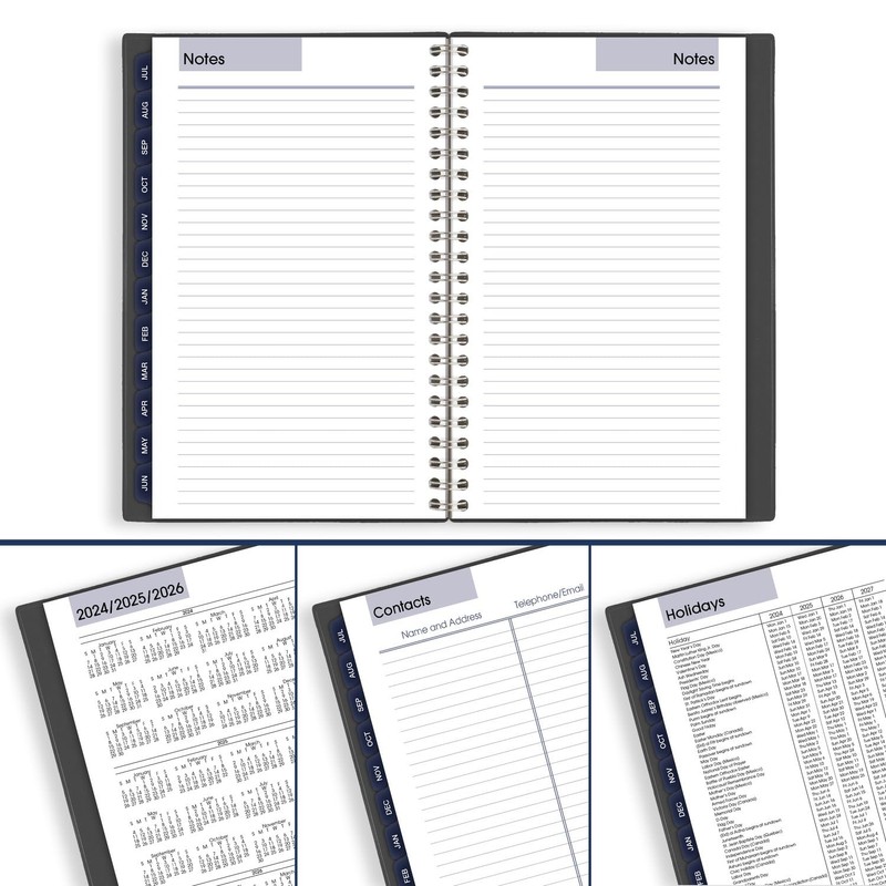- ENHANCED ORGANIZATION – Extra pages include a 3-year reference calendar, holiday list, important dates, contacts pages, 14 notes pages and time zones
