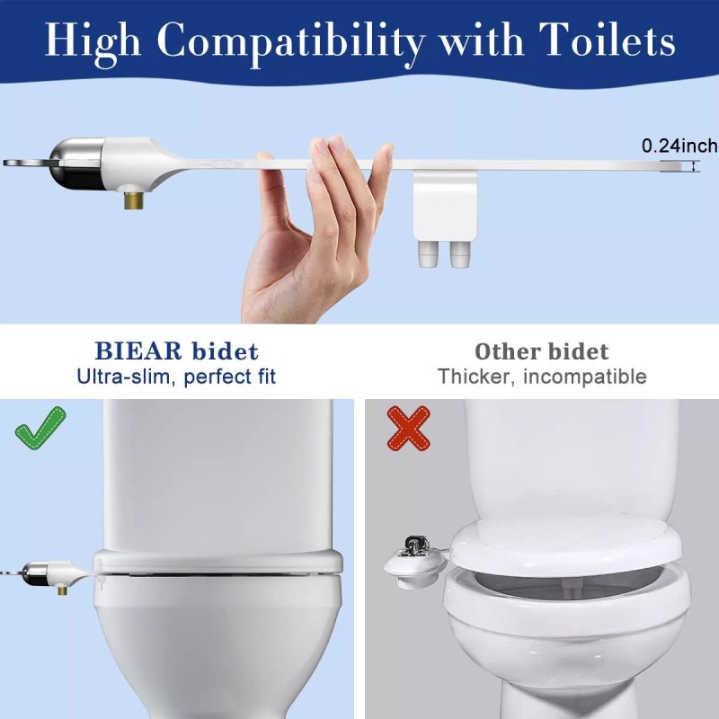 【Ultra-Slim-Adjustable Pressure Bidet】:This bidet is only 0.24 inches thin and can keep your toilet seat level. The water pressure control knob allows you to adjust the water pressure, creating a comfortable and easy-to-use experience, Gentler cleaning for those suffering from hemorrhoids or other conditions that lead to irritation and pain when visiting the bathroom, which is convenient for the elderly and people with mobility impairments to enjoy a perfect healthy life.