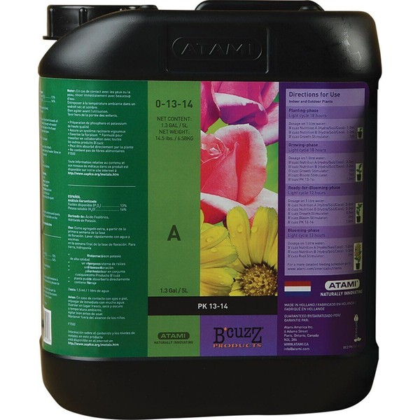 B’Cuzz PK1314 is a high quality flowering preparation with Phosphorous and Potassium. Fast growing plants require Phosphate and Potassium in order to flourish in flowering. B’Cuzz PK1314 will stimulate exuberant floral development rapidly. This formula is fully soluble in water and is especially suited for the flower phase of the plant. PK1314 ensures firm, dense budding. Use of PK 1314 in the B’Cuzz feeding schedule eliminates the need for a growth and flowering formula. B’Cuzz PK1314 used in conjunction with B’Cuzz Nutrients A & B modifies the formula into a flowering formula. B’Cuzz PK 1314 is most effective when used in conjunction with B’Cuzz Nutrients. To ensure best results, use B’Cuzz stimulants in conjunction with the B’cuzz feeding schedule. Do not use B’Cuzz PK1314 in conjunction with B’Cuzz Tabzz.