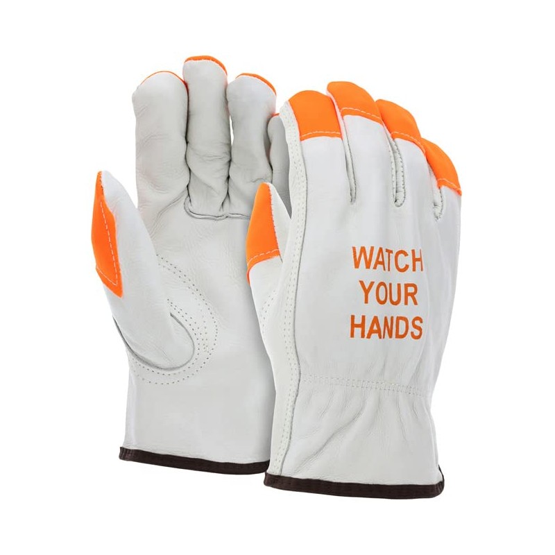 ATERET 12 Pairs 2X-Large Hi Vis Heavy Duty Durable Cowhigh Leather Work Gloves I Orange Tip - Watch Your Hand I Driver Gloves for Truck Driving, Warehouse, Gardening, Farming (2X-Large, 12)
