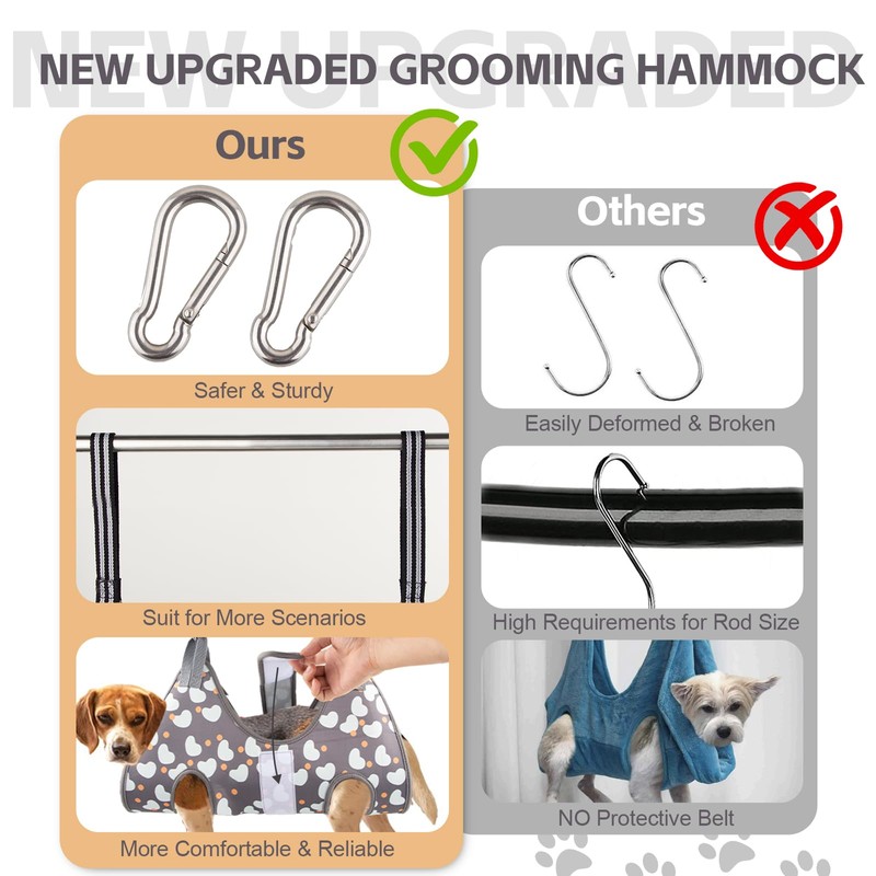 - [Save Money and Time] Pet grooming hammock for nail trimming helps you easier accomplish grooming your fur baby, such as trimming nails, eye care, ear health care, grooming, bathing, injections, etc. Dog grooming hammock allows you to groom at your own pace, without an appointment hassle, while building a strong bond between you and your pup.