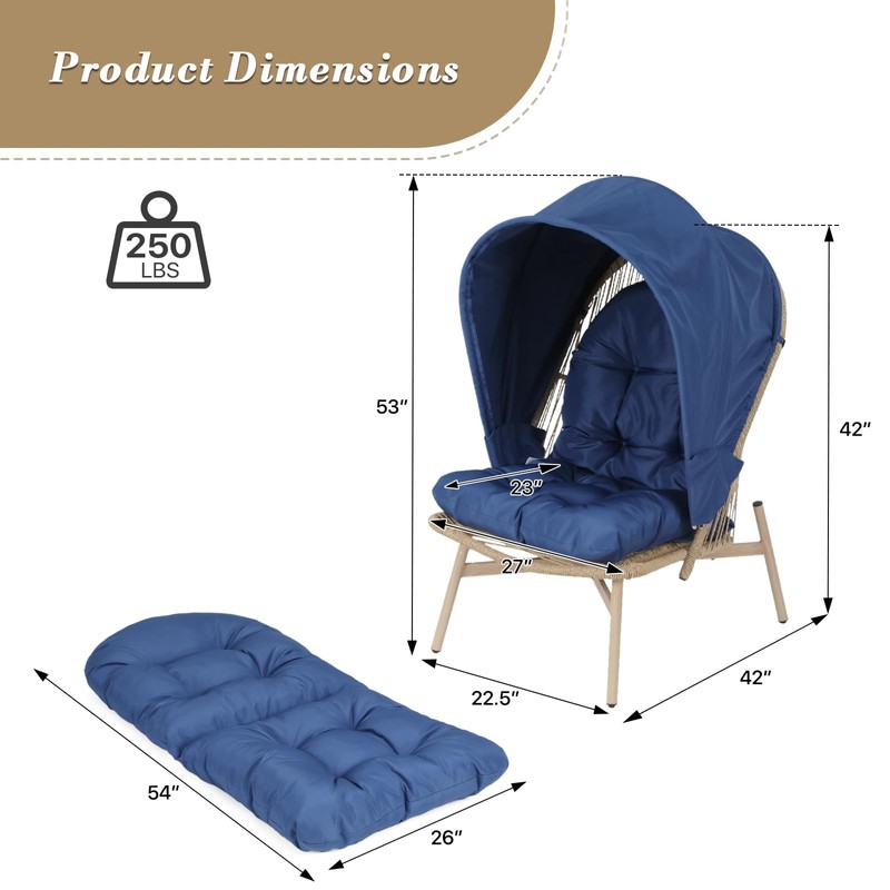 - Egg Chair with Canopy: This outdoor lounge chair features a built-in canopy that provides shade and a cozy, private spot to relax. The canopy is foldable and removable, so you can easily adjust it to your preference. Made from waterproof and sun-resistant fabric, it also has secure ties to keep it firmly in place.
